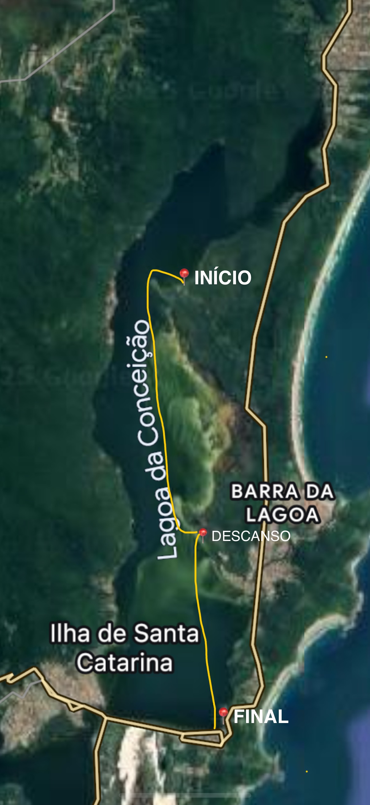 Iniciamos nossa aventura no Rio Vermelho com destino à Avenida das Rendeiras. Vamos aproveitar o vento nordeste e pegar carona para atravessar a Lagoa da Conceição. No trajeto admiramos o cenário dos morros da Costa da Lagoa cobertos pela Mata Atlântica, enquanto o vento nos dá uma forcinha.